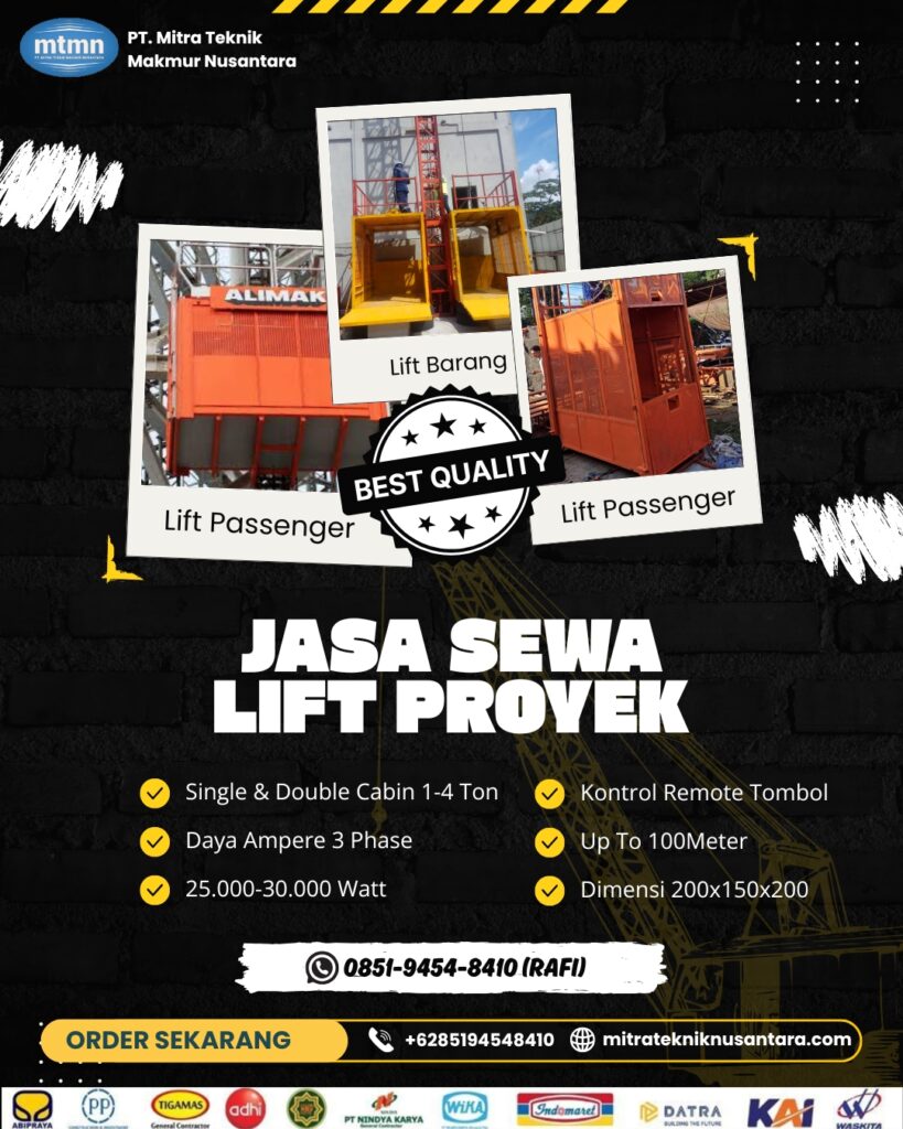 Untuk mendukung kelancaran proyek, PT. Mitra Teknik Makmur Nusantara (MTMN) hadir sebagai penyedia jasa sewa lift proyek dan crane proyek terpercaya di Manado — menawarkan alat berkualitas tinggi, pelayanan cepat, dan harga kompetitif untuk berbagai kebutuhan konstruksi Anda.