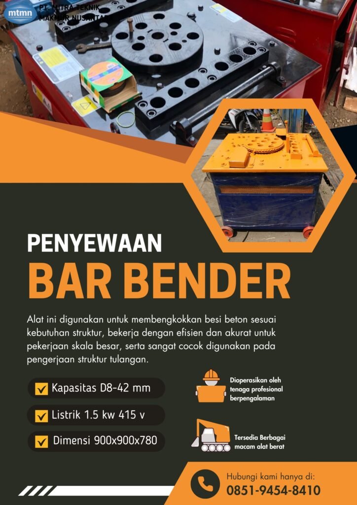 PT Mitra Teknik Makmur Nusantara (MTMN) menyediakan layanan sewa Bar Bender dan Bar Cutter untuk mendukung pekerjaan pembesian proyek konstruksi di Palembang, Sumatera Selatan. Mesin yang kami hadirkan dirancang untuk menghasilkan pembengkokan serta pemotongan besi beton secara presisi, cepat, dan konsisten sehingga kualitas struktur bangunan tetap sesuai standar teknik.