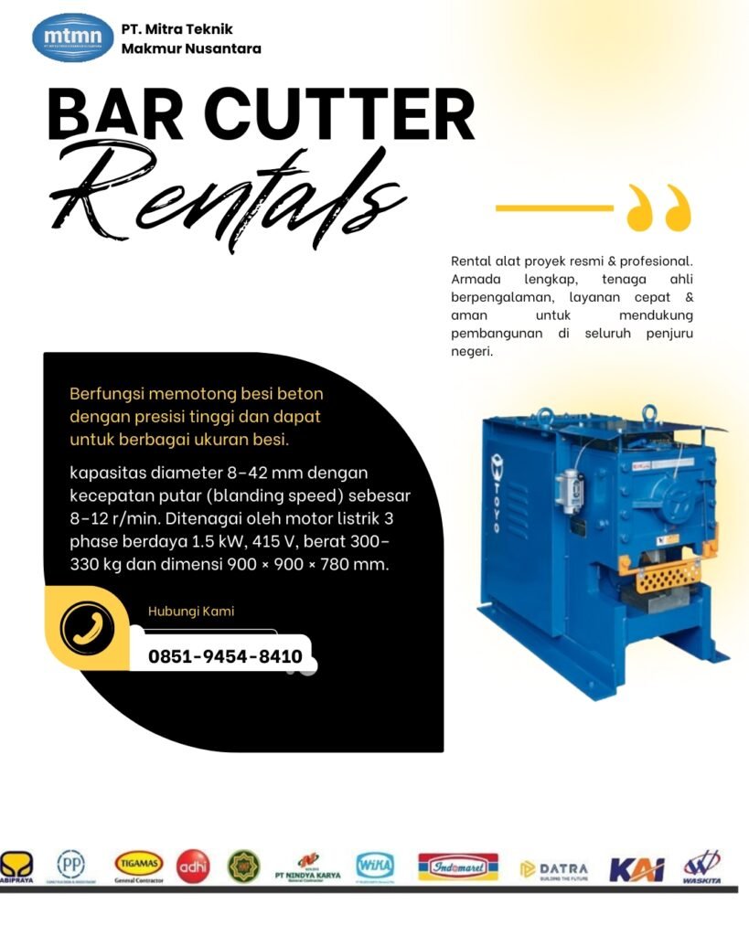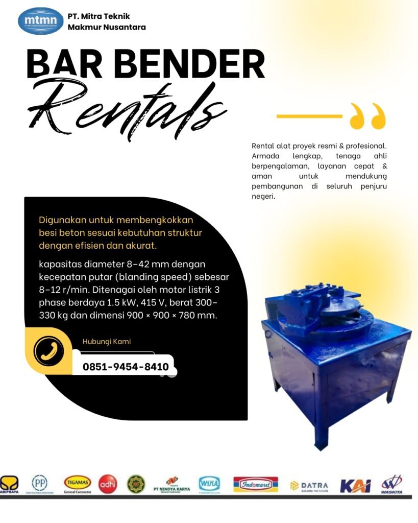 MTMN melayani kebutuhan rental Bar Bender dan Bar Cutter mulai dari proyek rumah tinggal, bangunan bertingkat, apartemen, kawasan komersial, hingga proyek infrastruktur berskala besar. Bar Bender berfungsi membentuk besi beton sesuai detail perencanaan, sedangkan Bar Cutter digunakan untuk memotong tulangan dengan ukuran presisi.