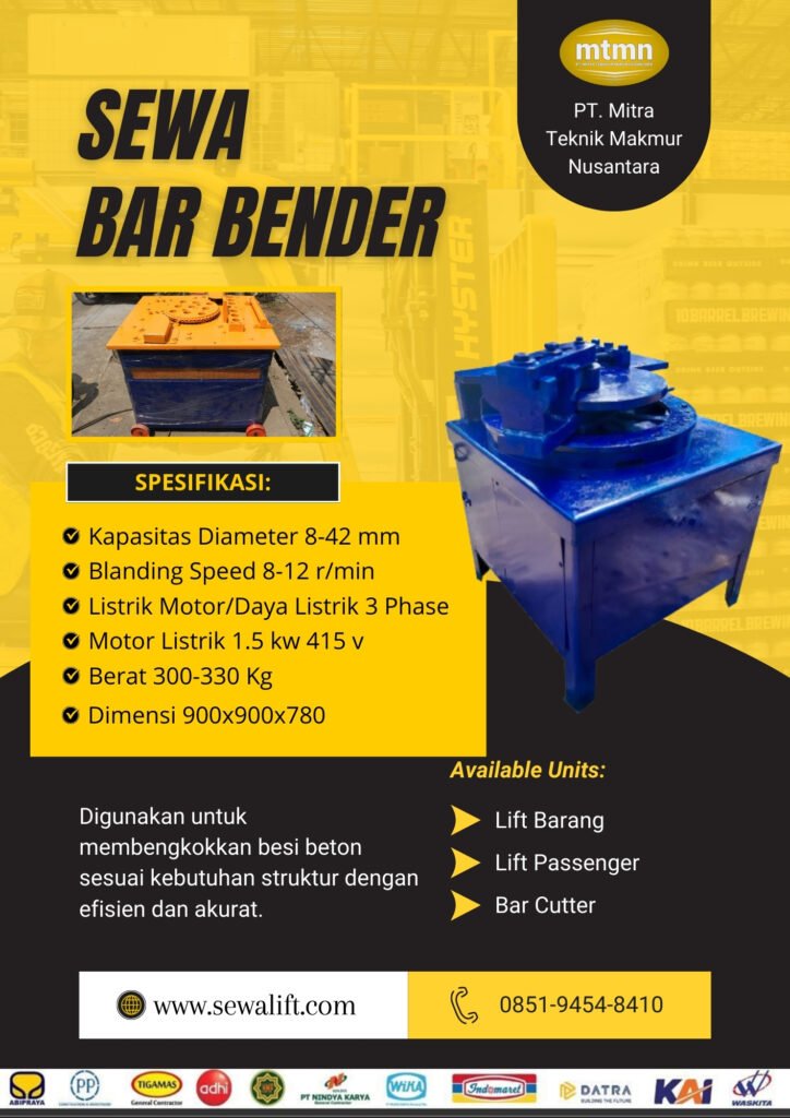 PT Mitra Teknik Makmur Nusantara (MTMN) melayani sewa Bar Bender untuk berbagai jenis proyek konstruksi, mulai dari gedung bertingkat, perumahan, pabrik, jembatan, hingga proyek infrastruktur lainnya. Karena memiliki daya tekuk yang kuat dan presisi tinggi, Bar Bender sangat cocok digunakan untuk proyek kecil hingga besar di wilayah Tapin dan sekitarnya.